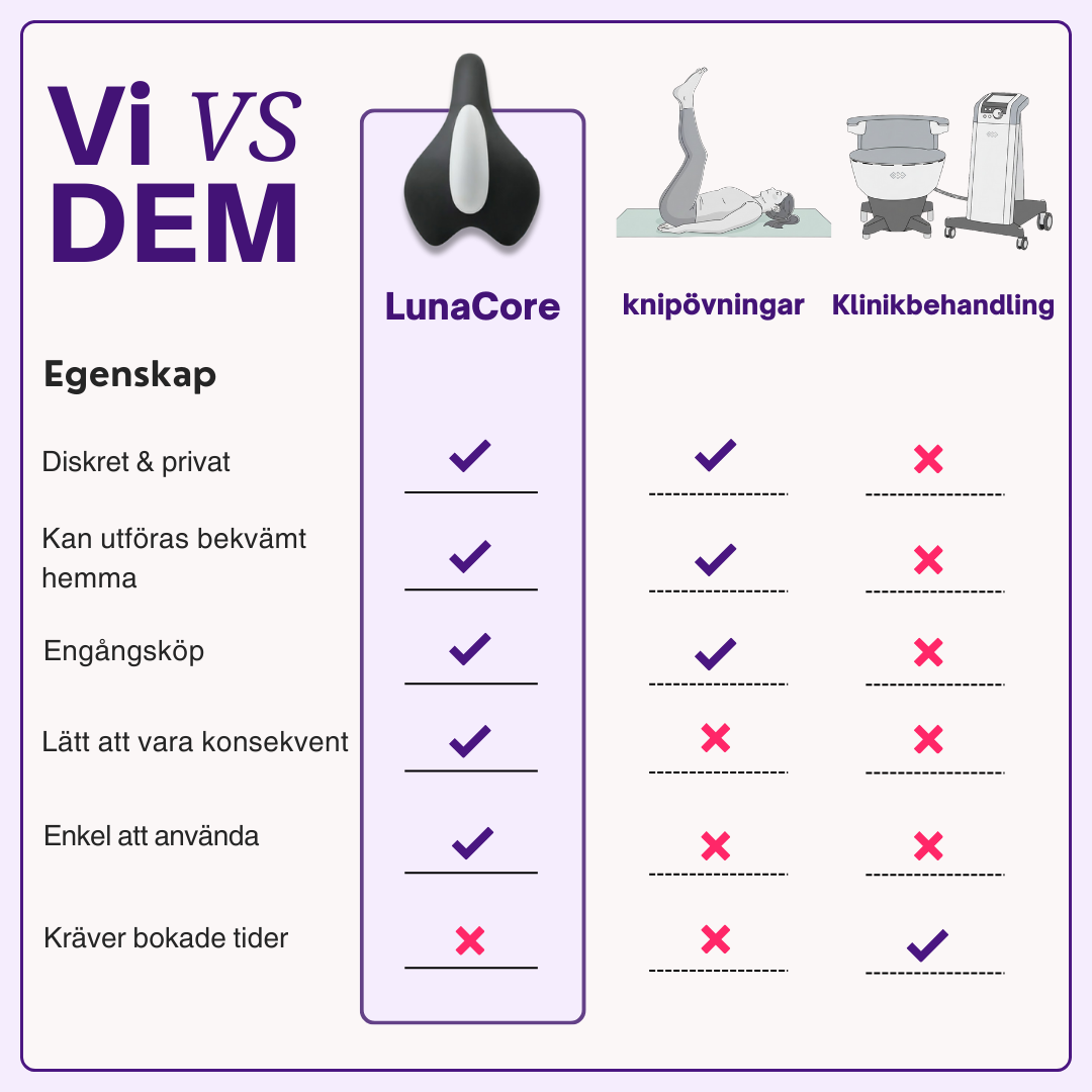 Regelbunden användning kan bidra till ökad muskelstyrka och bättre kontroll, med en enkel träningsrutin som kan utföras hemma på några minuter om dagen. LunaCore är diskret, anatomiskt utformad och anpassad för säker användning.